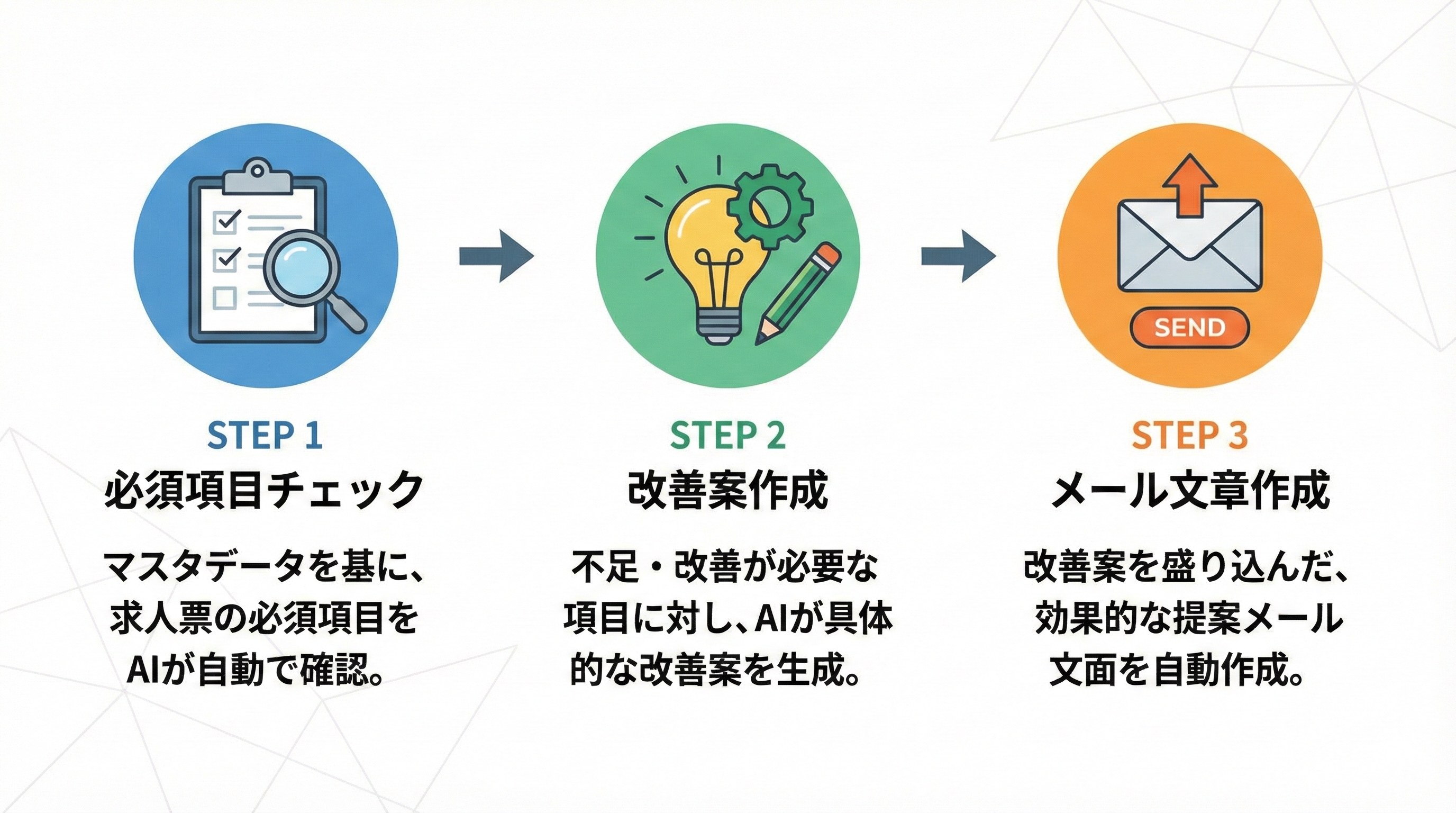 • 膨大な目視工数: 掲載されている多数の求人内容を一つひとつ目視で確認し、手作業で改善案を考える業務が大きな負担となっていた。