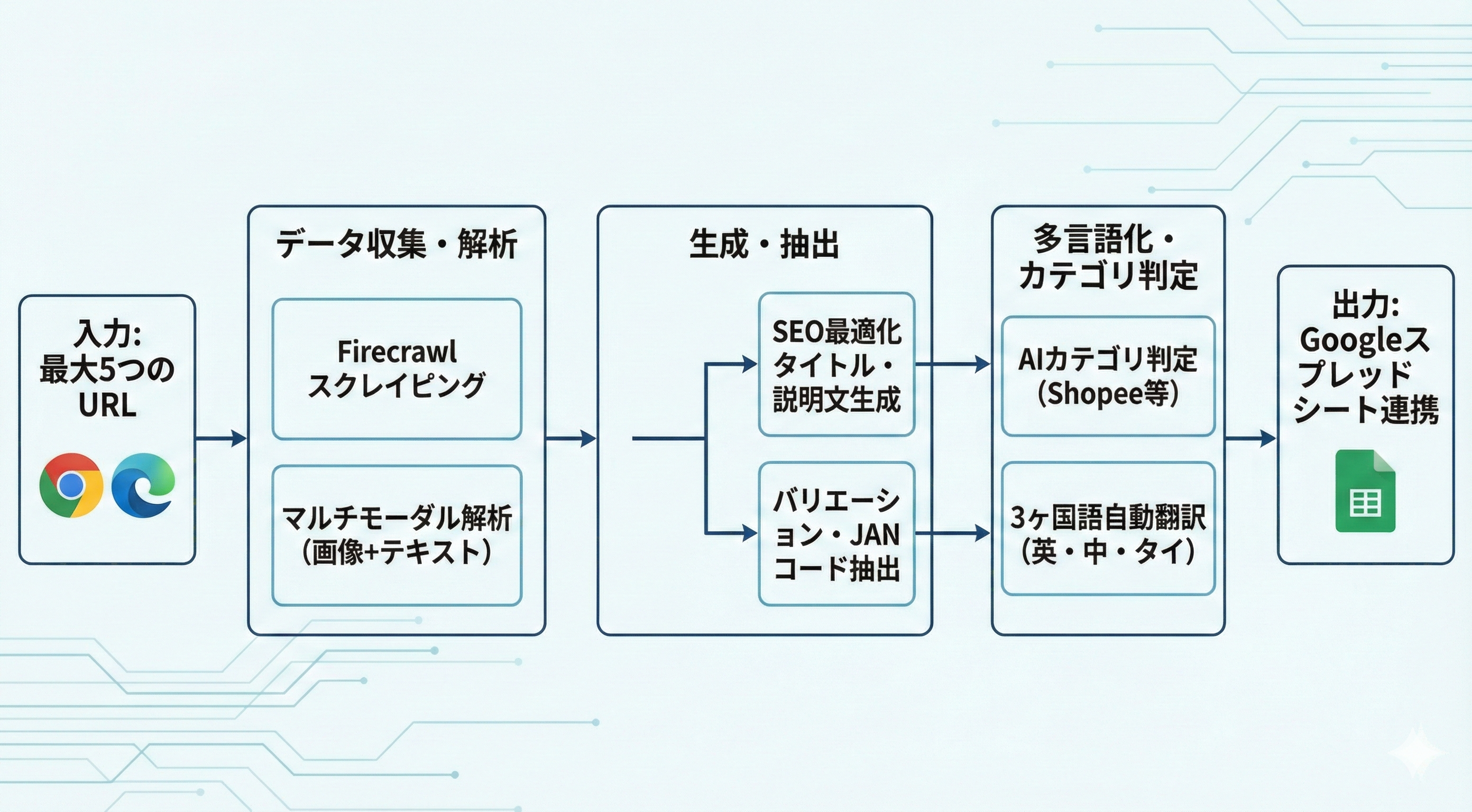 ECサイト運営における「商品説明文作成」の工数を劇的に削減するソリューションを構築しました。メーカーサイトや競合ショップなど、**最大5つのURLから情報を自動取得(スクレイピング)**し、それらを統合・分析。商品の特徴を網羅しつつ、SEOに最適化されたタイトルと説明文を生成します。さらに、バリエーション情報(JANコード等)の抽出や、東南アジア圏(Shopee等)への展開を想定した3ヶ国語への自動翻訳までを一気通貫で実行します。